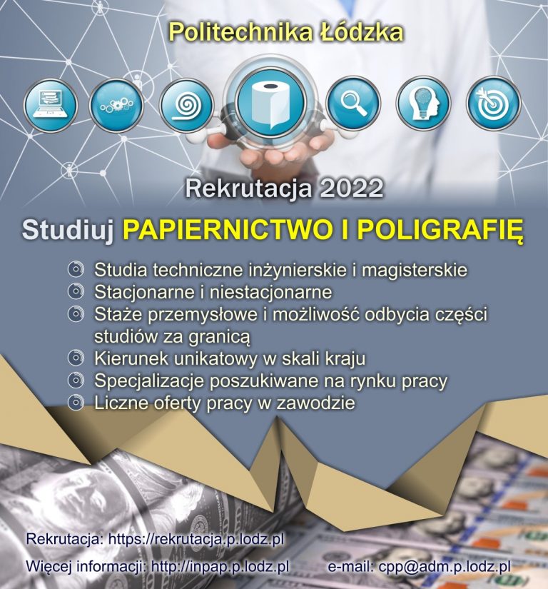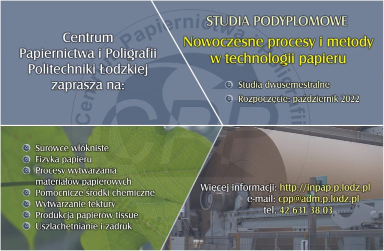 Przedłużamy rekrutację na Studia podyplomowe!!! NOWOCZESNE PROCESY I METODY W TECHNOLOGII PAPIERU w Centrum Papiernictwa i Poligrafii Politechniki Łódzkiej Rekrutacja trwa do 17.10.2022 r. Organizator Politechnika Łódzka, Centrum Papiernictwa i Poligrafii, ul. Wólczańska 221, 93-005 Łódź, www.inpap.p.lodz.pl ,